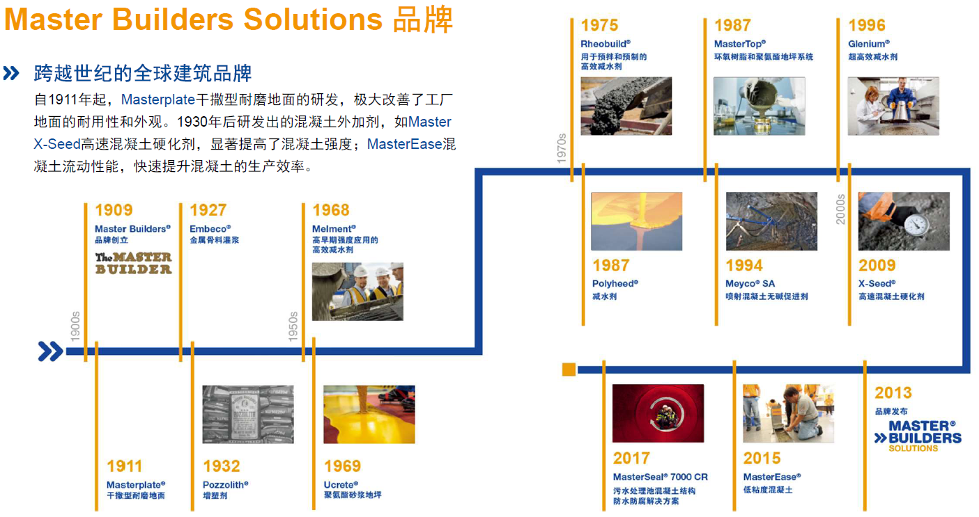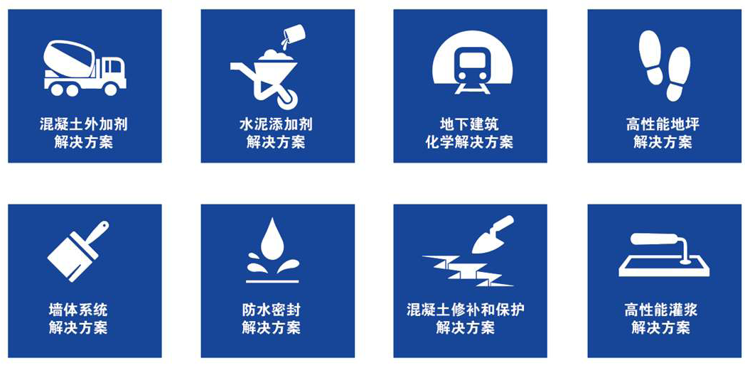 • 產(chǎn)品組合涵蓋:混凝土外加劑、水泥添加劑、地下建筑化學(xué)解決方案、防水密封系統(tǒng)、混凝土修補(bǔ)和保護(hù)系統(tǒng)、灌漿系統(tǒng)和功能性地坪系統(tǒng)以及陸上和海上風(fēng)能的解決方案。