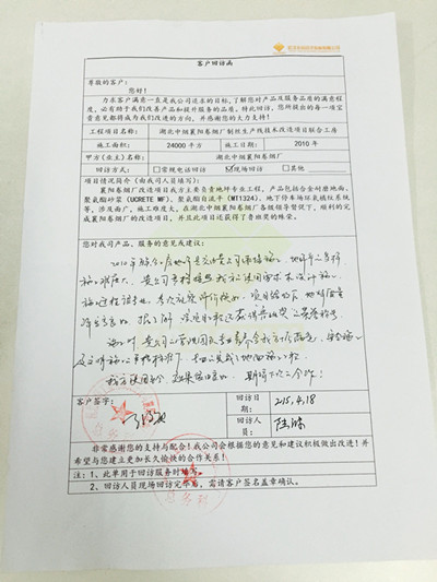 感謝襄陽卷煙廠總務(wù)科領(lǐng)導(dǎo)對(duì)我公司回訪工作的支持,襄陽卷煙廠改造項(xiàng)目是由我公司主要負(fù)責(zé)的地坪專業(yè)工程,產(chǎn)品包括合金耐磨地面、聚氨酯砂漿(UCRETE MF)、聚氨酯自流平(MT1324)、地下停車場環(huán)氧橘紋系統(tǒng)等,涉及面廣,施工難度大,在湖北中煙襄陽卷煙廠各級(jí)領(lǐng)導(dǎo)的督促下,順利完成襄陽卷煙廠的改造項(xiàng)目,并且此項(xiàng)目還獲得了魯班獎(jiǎng)的殊榮。隨著地坪種類的不斷豐富,應(yīng)用領(lǐng)域的不斷擴(kuò)大,地坪工程質(zhì)量已經(jīng)成為地坪行業(yè)持續(xù)發(fā)展的關(guān)鍵。一個(gè)優(yōu)質(zhì)的地坪工程產(chǎn)品,不再僅僅是面層材料選用和施工,更重要的是地面整體系統(tǒng),即面層+基層的整體方案設(shè)計(jì)與施工。武漢永信地坪用多年的經(jīng)驗(yàn)和口碑得到了客戶的認(rèn)可、得到了中國建筑材料聯(lián)合會(huì)地坪分會(huì)的官方認(rèn)證。武漢永信地坪將繼續(xù)致力于引進(jìn)更加綠色、節(jié)能環(huán)保的新型建材,用我們自己的產(chǎn)品為我們代言!