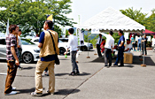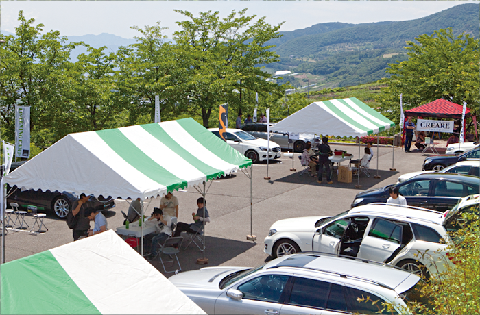 これまでもホームページなどでお伝えしてきましたように、ソニックデザイン リスニングキャンプは「細かなスケジュールを設(shè)けない」「誰でも申し込みなしで好きな時間に立ち寄れる」「參加者のお名前や連絡(luò)先を敢えて伺わない」「コンテストなどの勝負をしない」といった"ユルい"イベントを目指しています。これは弊社が初めて主催するお客様向けイベントとして、カーオーディオの楽しさをもっとも純粋に、また身近に味わっていただくにはどうしたら良いかをいろいろ考えた結(jié)果なのですが、果たしてこの"ユルい"コンセプトをお客様に受け入れてもらえるかどうか、混亂や事故など不測の事態(tài)が発生しないか、スタッフ一同、正直不安もありました。しかも當日の天気予報は雨。會場に設(shè)営するテントの數(shù)を倍に増やしたり、交通整理のアルバイトも増員したりと、"ユルい"中にも出來る限りの手を盡くして本番に臨みました。