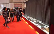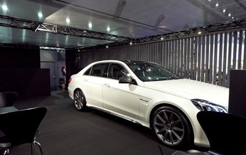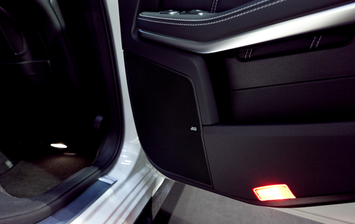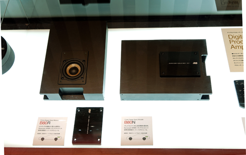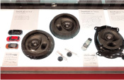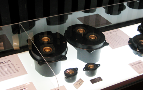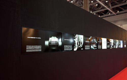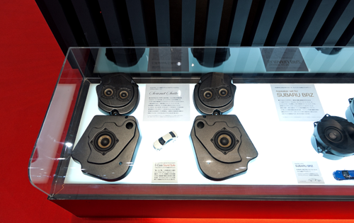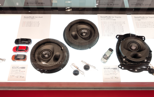 今回のソニックデザインブースでは、77mmスーパーバスモジュールの「B80N」「B80R」、そしてSonicPLUSのアウディ車専用スピーカーパッケージ6機(jī)種(A4専用の「SP-A48M」「SP-A48E」、A3専用の「SP-A33M」「SP-A33E」、A1専用の「SP-A11M」「SP-A11E」)の計(jì)8機(jī)種がワールドプレミア(世界初公開)されました。また、10月の発売以來「3時(shí)間で取り付けられるハイエンドスピーカー」として注目を浴びるSonicPLUS THE CRESTのプリウス専用モデル「3C-P30」も実物を展示。全長9mのショーケースいっぱいに新製品や人気製品が並べられています。いっぽうブース內(nèi)部には、メルセデスとソニックデザインとのコラボレーションが生んだ純正オプショナルサウンドシステムの最高峰「E-Class Sound Suite」(新型)を搭載したE63AMG Sを展示。今回は展示のみで試聴デモは行っておりませんが、ご希望のお客様には後日試聴していただけるようメルセデス?ベンツ販売店をご紹介いたしますので、スタッフにお申し付けください。