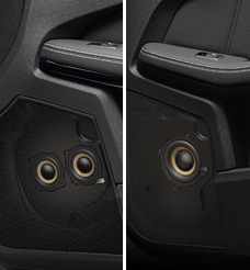 車前門安裝的「The Suite Unison-Array」(左)和車后門安裝的「The Suite Extend-Woofer」(右)。每一個揚聲器都會在汽車內(nèi)部安裝,外觀上不會有任何改變(圖象為合成,實際安裝后是看不到揚聲器的)。